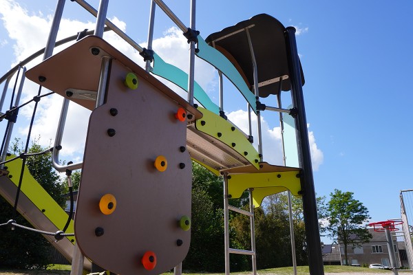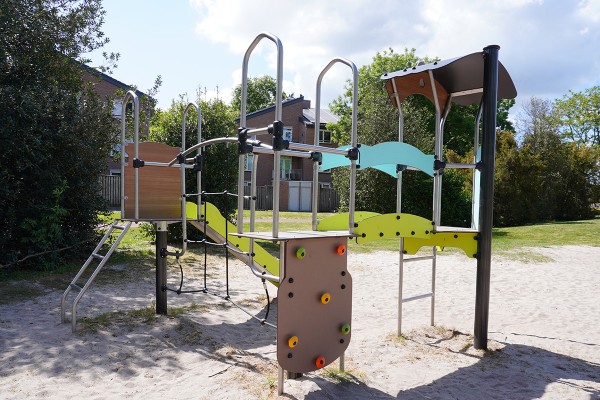 Multiplay equipment with slide, bridge, and climbing activities in pastel and wood colours - J3832-C