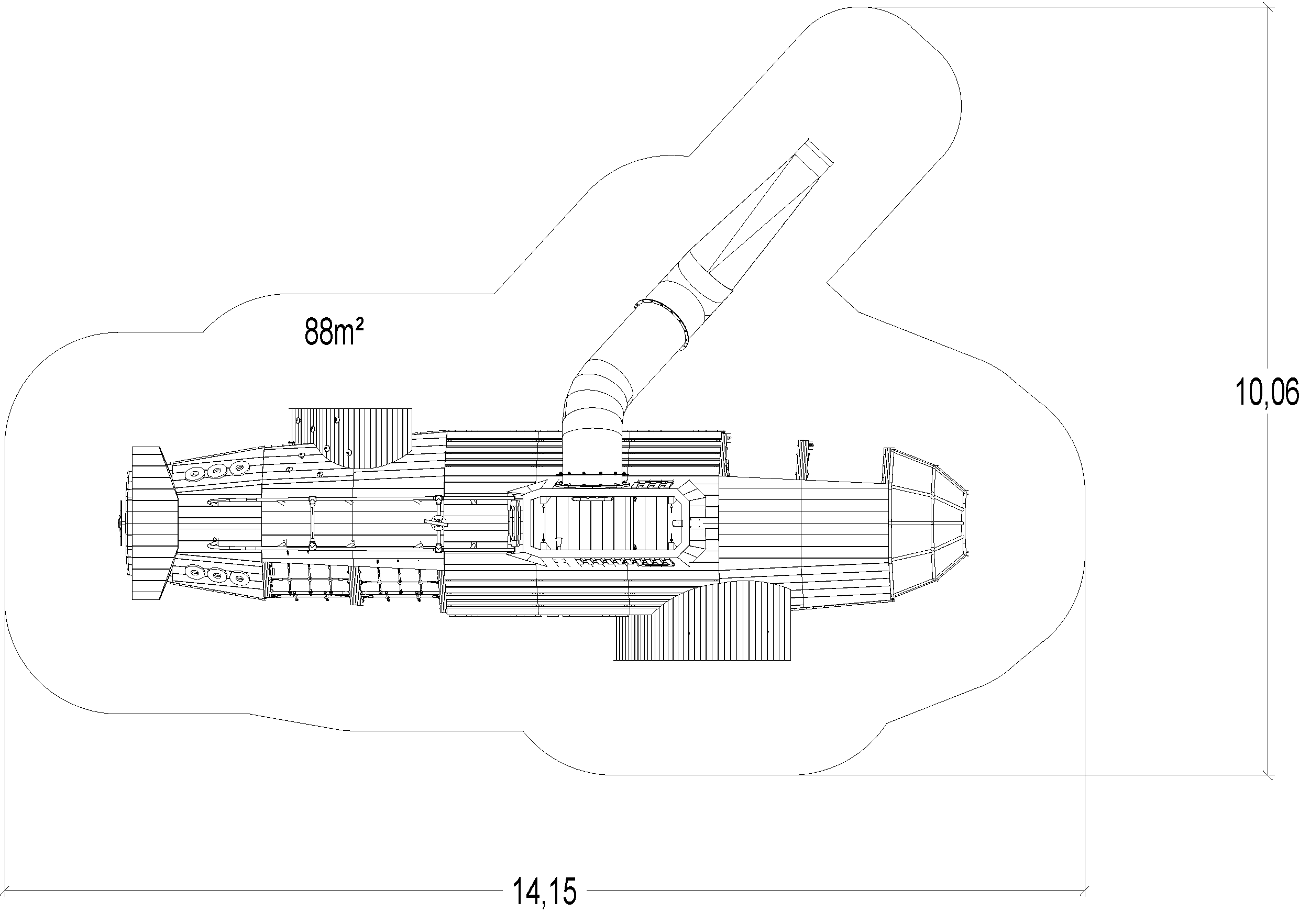 The size of the module is: 11.15 m length, 6.84 m width, 3.87 m. high. The free fall height (FFH) is 1.70 m.