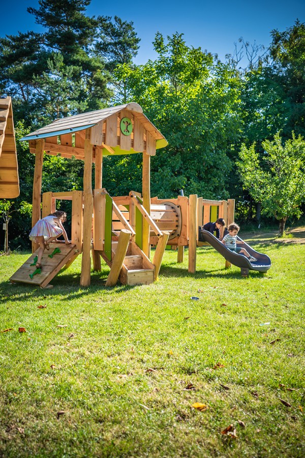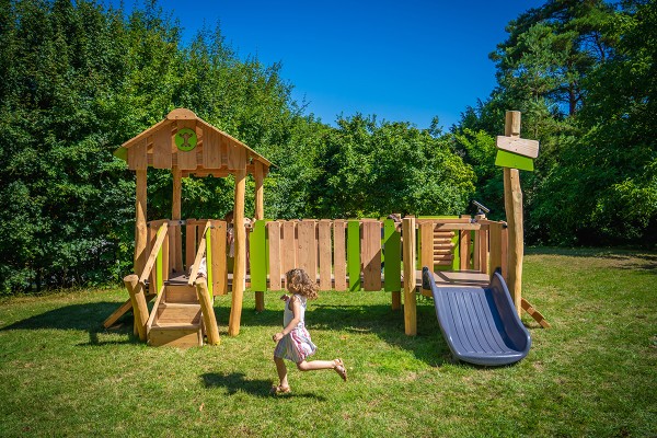 Wooden play structure for young children with slide, cabin and play panel - J49250®